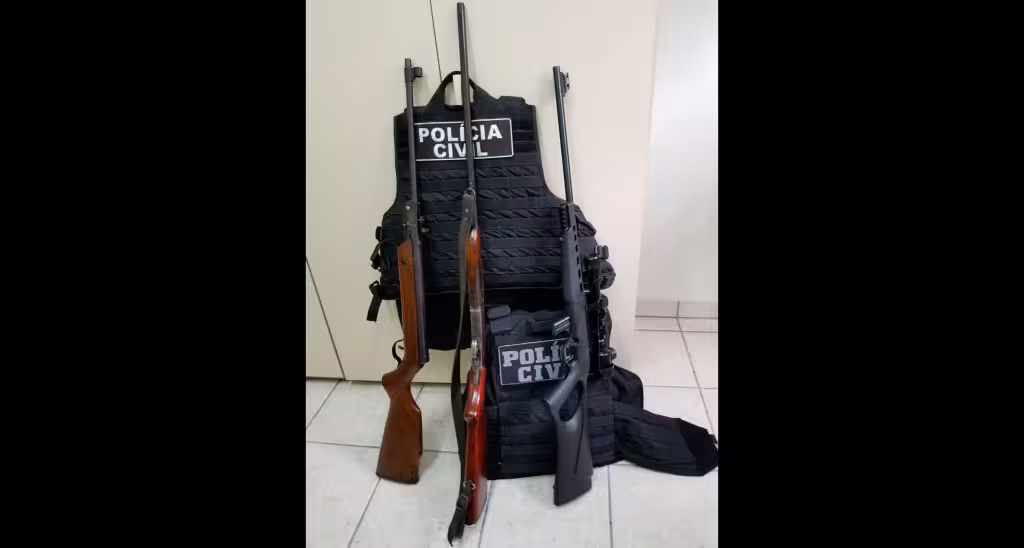 Durante as buscas foram encontradas três armas de fogo, sendo um rifle, calibre 22 CBC com registro, porém o documento não foi apresentado até o momento.
