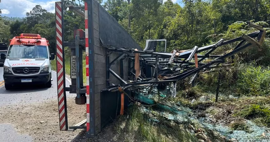 Três pessoas ficam feridas após caminhão com carga de vidro tombar na Gentil Battisti Archer, em Nova Trento