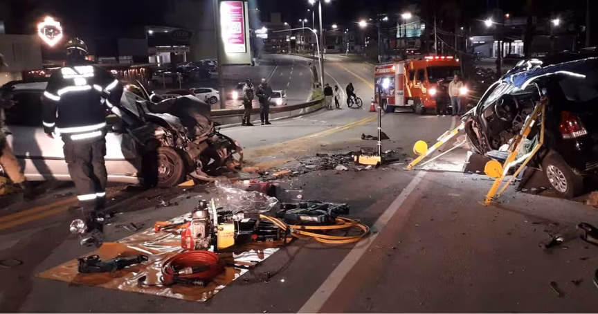 Três pessoas ficaram feridas após uma forte colisão frontal entre carros na noite dessa sexta-feira, 14. O acidente aconteceu por volta das 22h30, no viaduto avenida das comunidades, no Centro de Gaspar.