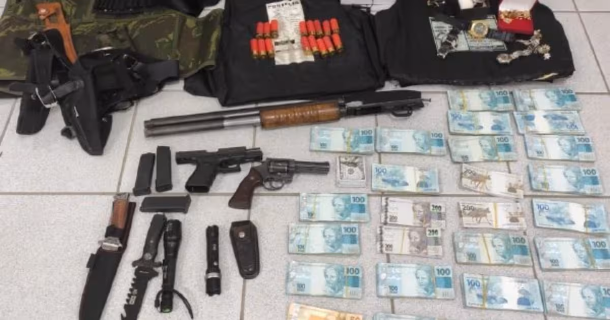 Ao todo, com os homens a polícia encontrou três armas de fogo, mais de 150 munições de diversos calibres, três coletes balísticos, vários relógios e joias, além de R$ 133,6 mil em dinheiro e 3,2 mil dólares. Todo material foi apreendido e os suspeitos conduzidos a delegacia de Polícia Civil.