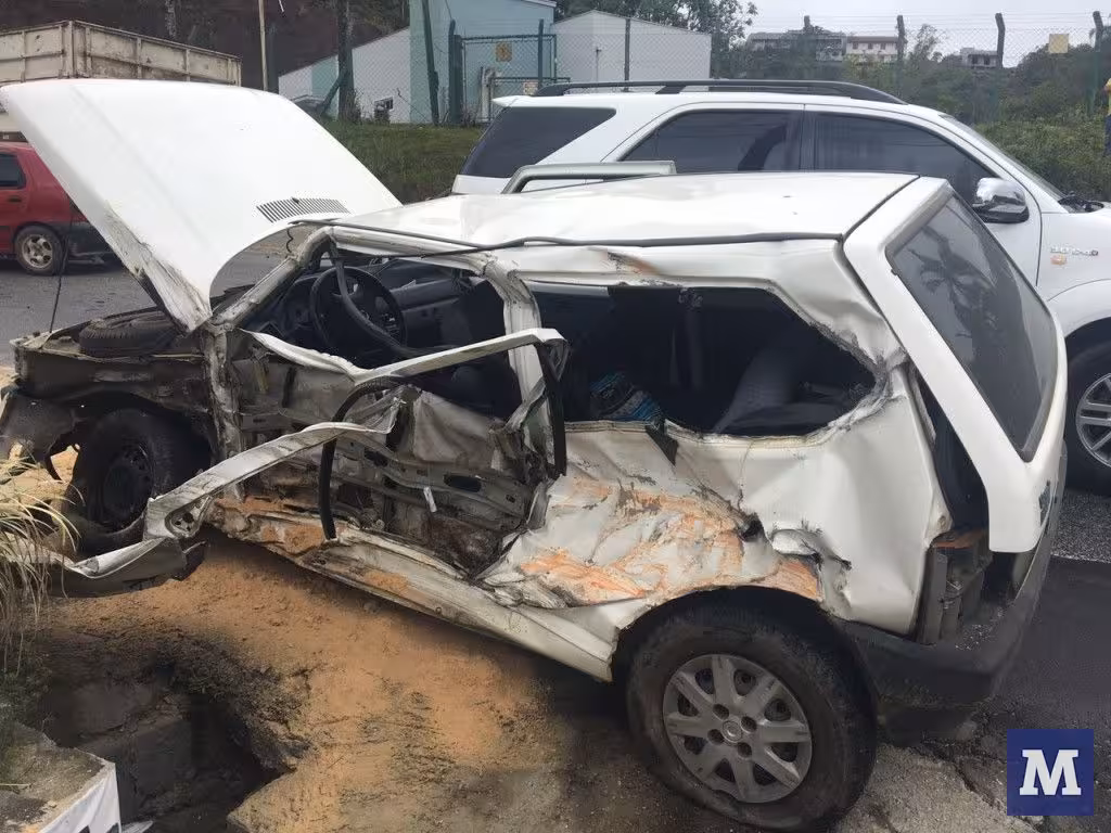 Ao chegar no local, o Corpo de Bombeiros encontrou o motorista do veículo, de 42 anos, fora do carro. Ele estava com ferimentos pelo corpo e um corte leve na cabeça.