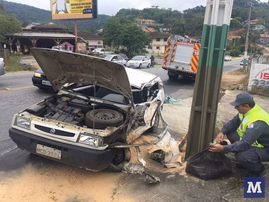 Por volta do meio-dia desta segunda-feira, 31, uma colisão deixou um veículo Uno, de Brusque, destruído, após o motorista perder o controle da direção na curva próxima à empresa Liquigás.