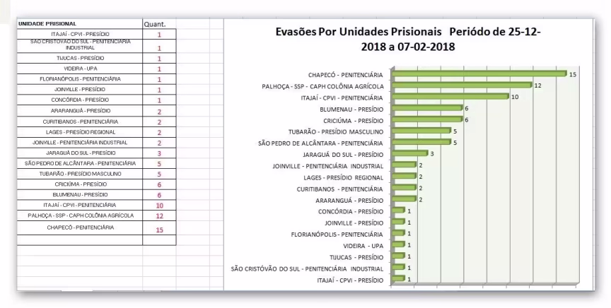 A penitenciaria de Chapecó teve o maior número de apenados que não voltaram após a saída de fim de ano. Foram 15 ao todo. Ela é seguida da Colônia Prisional Agrícola de Palhoça, com 12, e da Penitenciária de Itajaí, com 10. O Presídio de Blumenau aparece na sequência, com seis.