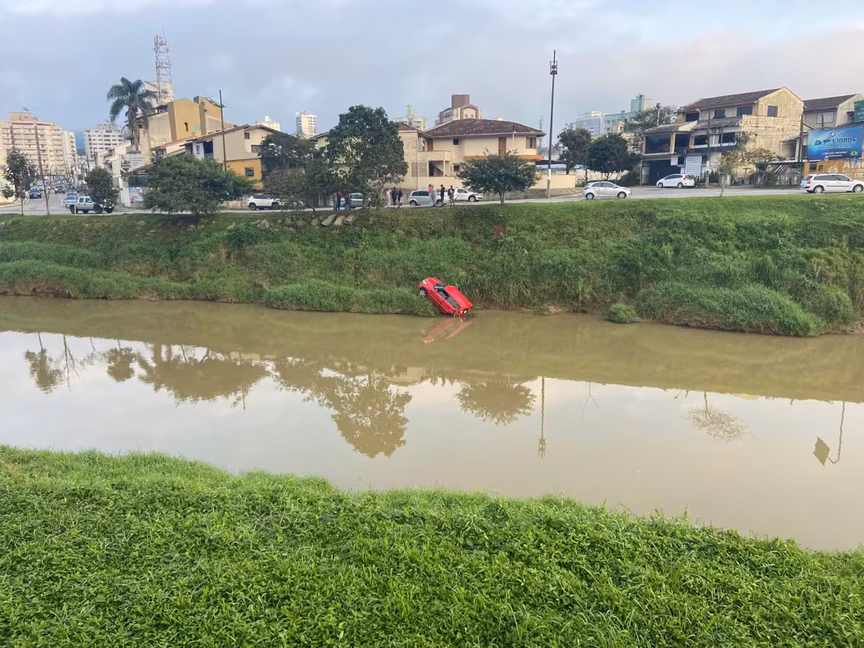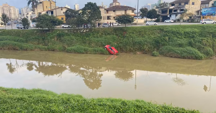 Um carro caiu no rio Itajaí-Mirim na manhã desta terça-feira, 22, em Brusque. O acidente ocorreu na avenida Beira Rio, perto do Sesc.