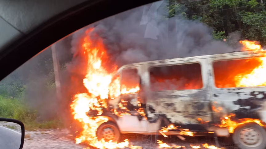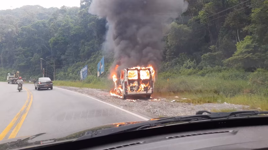 O condutor do veículo, um homem de 61 anos, relatou ter percebido uma alteração na van e, ao parar no acostamento, as chamas se iniciaram na parte do motor.