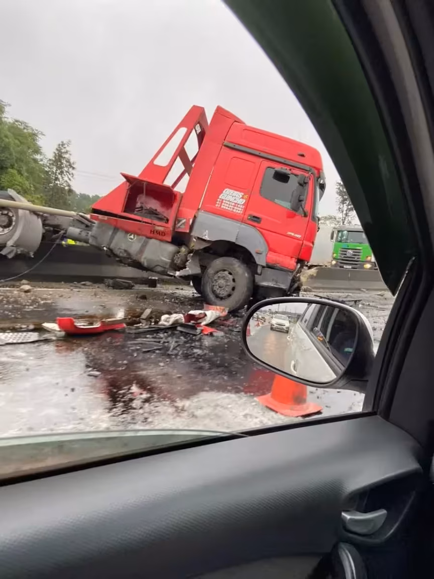 Os veículos envolvidos no acidente foram um caminhão Scania P360 azul, um caminhão MB 2540 vermelho e um Jetta prata.