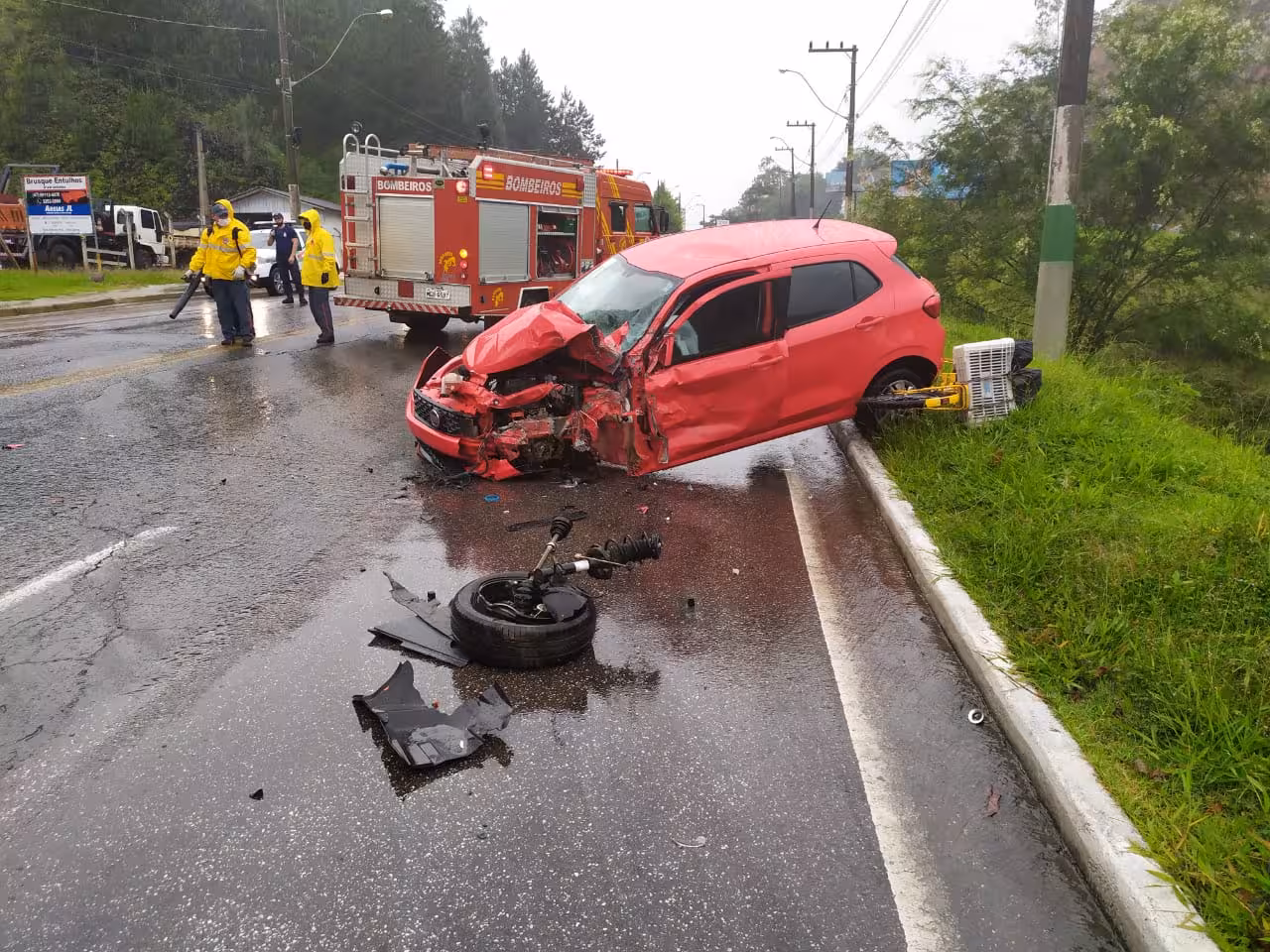 Segundo o Corpo de Bombeiros, o acidente aconteceu por volta das 10h30. O motorista do carro Fiat Argo, de cor vermelha, com placas de Brusque sofreu escoriações no peito e no antebraço. O rapaz de 24 anos não quis ser conduzido ao hospital.