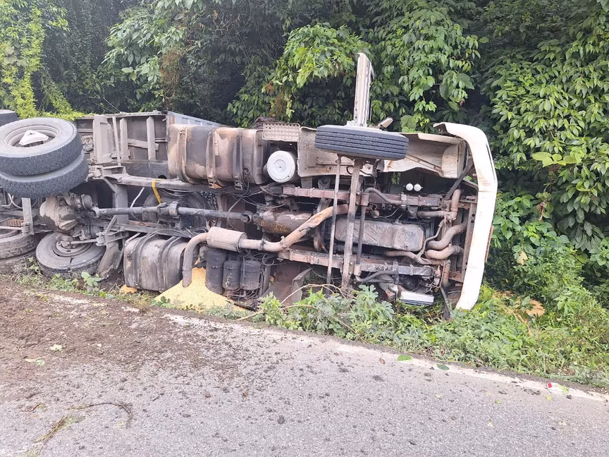 O caminhão ficou tombado fora da via e a carga espalhada foi contida para evitar riscos ao tráfego.