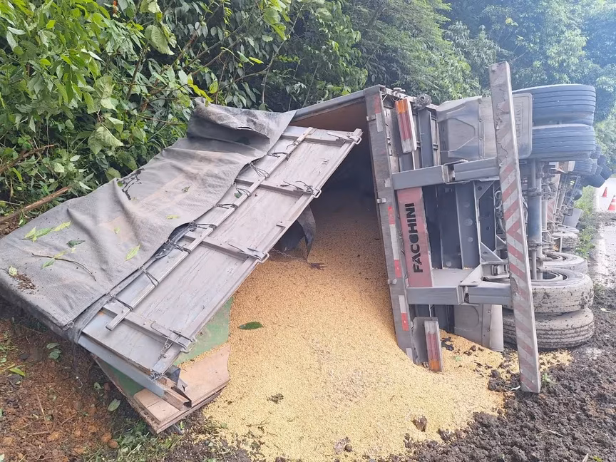 O caminhão Scania, atrelado a dois semirreboques, seguia de Campo Alegre para Joinville. O condutor relatou que perdeu o freio do veículo e, para evitar um acidente maior, desviou para fora da rodovia, onde acabou tombando. Apesar do susto e do derramamento de parte da carga de soja no acostamento, ninguém se feriu.