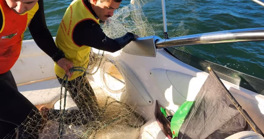 Ao chegarem ao local, os resgatistas identificaram que o animal estava preso pela nadadeira caudal em uma rede de pesca que se estendia por mais de 60 metros. A baleia, um exemplar de porte médio, demonstrava sinais de exaustão devido ao esforço para se libertar.
