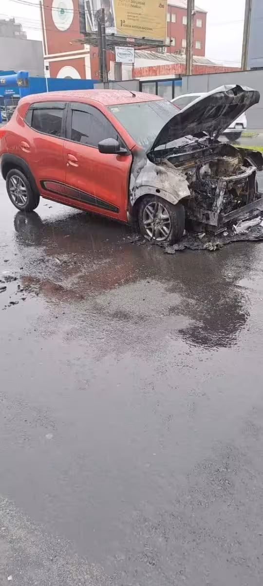 Um carro pegou fogo na avenida Coronel Procópio Gomes, em Joinville, na manhã desta quinta-feira, 10.