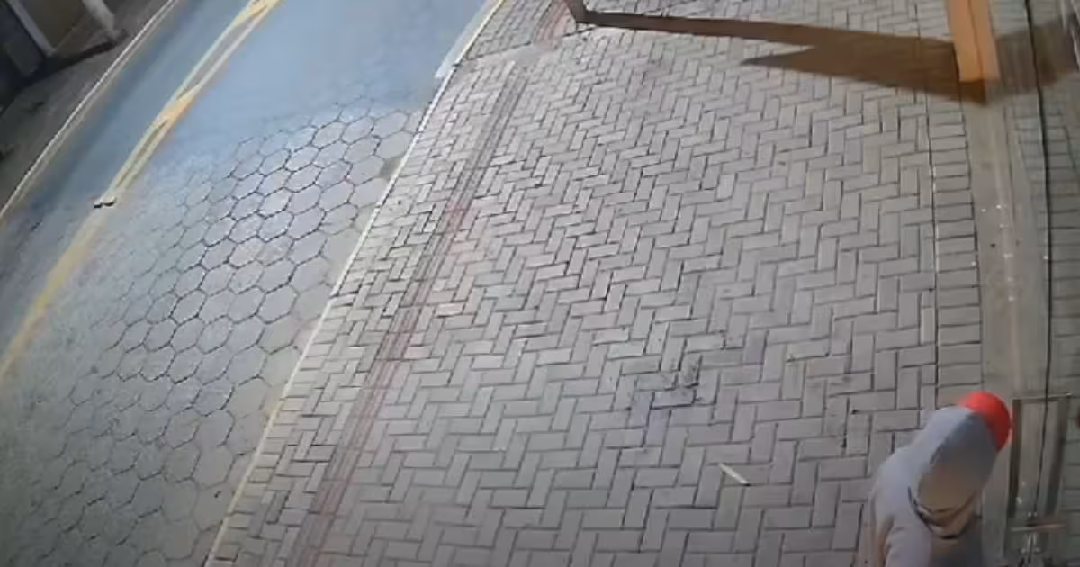 Pelas imagens de três câmeras de segurança, é possível ver o homem se aproximando com o objeto na mão e tentado quebrar o vidro. Em ambas as ações o homem estava sozinho e a pé.