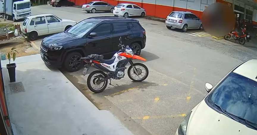 Nas imagens, que circulam pelas redes sociais, é possível ver um homem próximo ao muro do supermercado que quase é atingido pela motocicleta.