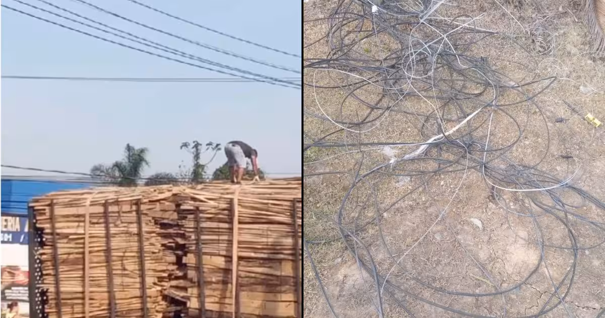 Moradores do bairro Guarani registraram na tarde desta segunda-feira, 18, um acidente envolvendo um caminhão e fios elétricos. Na ocasião, o veículo que estava carregando madeira acabou ficando mais alto que a rede de fios da via, o que resultou em metros de fios arrebentados.