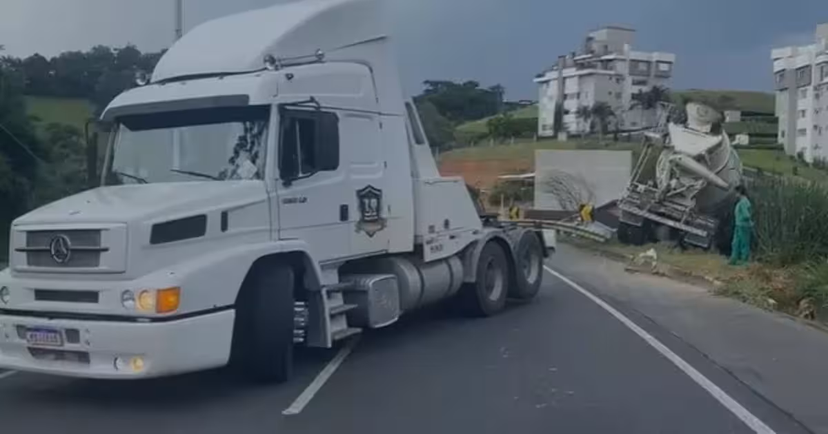 Um caminhão de transporte de concreto caiu em ribanceira na Via Expressa, sentido BR-470, na tarde desta sexta-feira, 13.