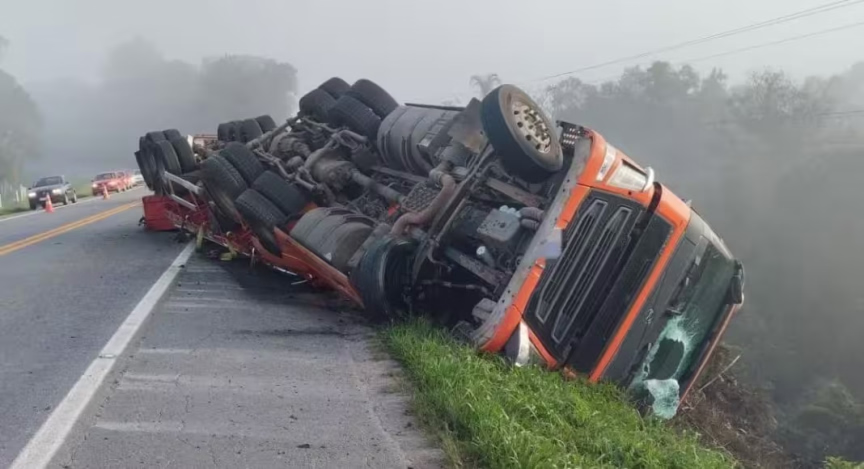 Segundo o Corpo de Bombeiros, o acidente aconteceu por volta das 7h50, entre Rio Negrinho e Mafra. O caminhão carregava chapas de compensado e a carga havia se espalhado pelas margens da via.