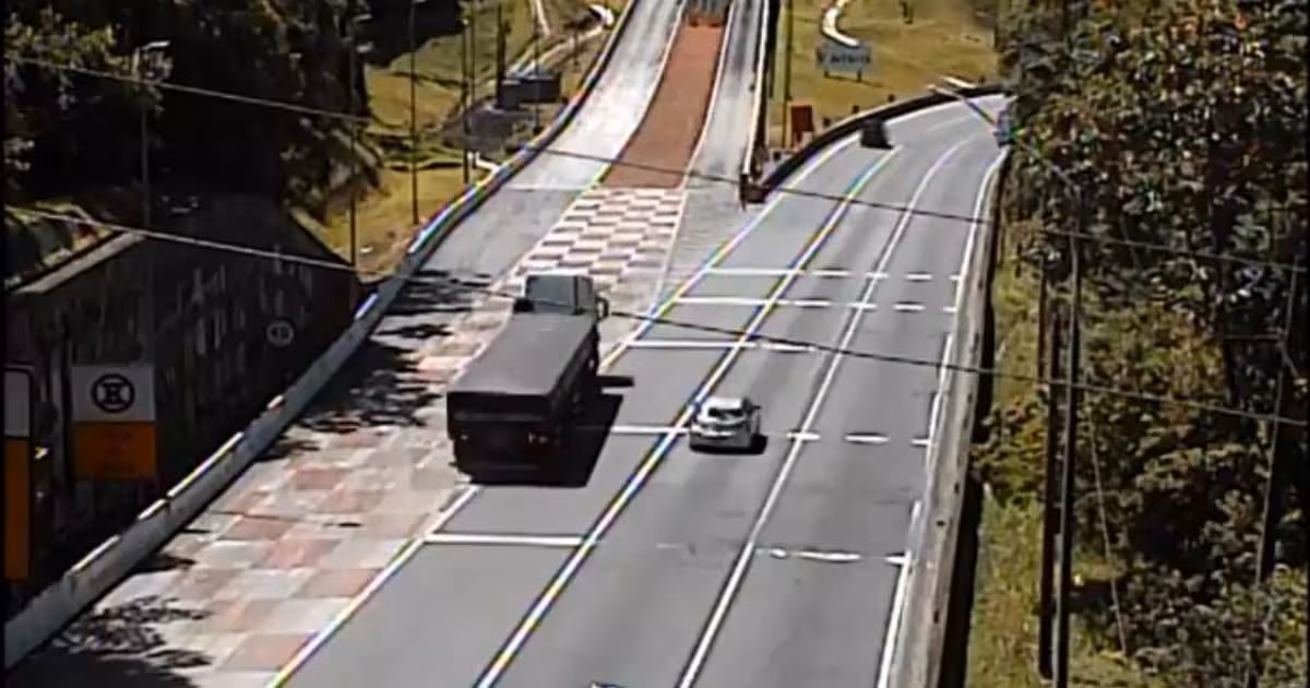 O condutor, que já conhecia o dispositivo, optou por adentrar na cinemática após a carreta apresentar pane nos freios. Ninguém se feriu.