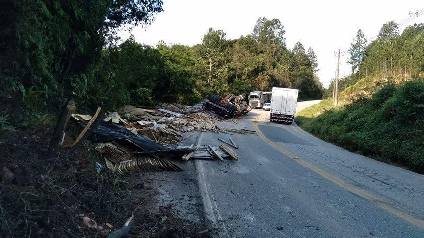 Na tarde desta terça-feira, 26, um caminhão, da marca Volvo, tombou na rodovia Pedro Merizio, a SC-486, em Botuverá. O veículo, que carregava madeira, perdeu o controle e tombou após a curva.