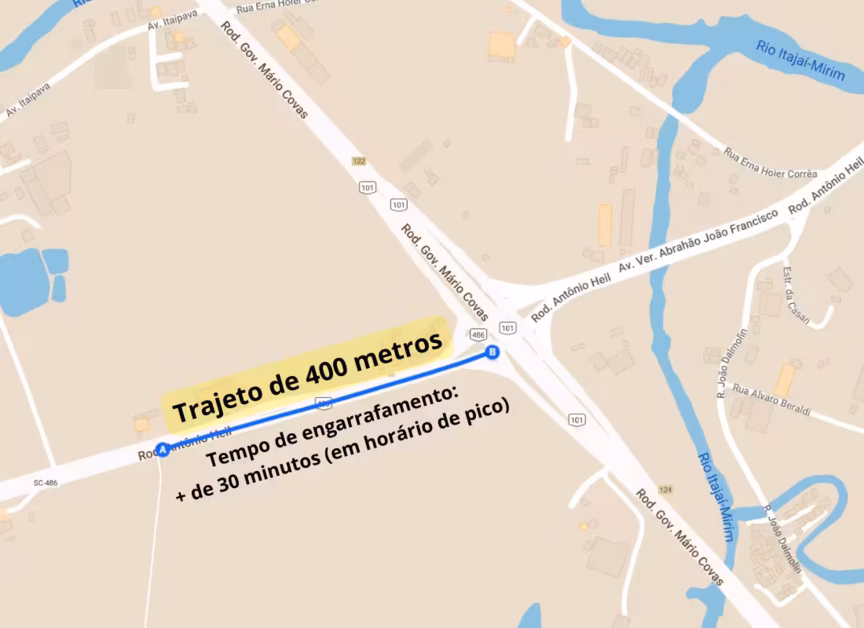 Não tem hora ou dia certo para o engarrafamento começar na rodovia Antônio Heil (SC-486) próximo ao trevo com a BR-101, em Itajaí. Contudo, o trânsito congestiona diariamente durante os horários de pico, durante a manhã e no fim da tarde.