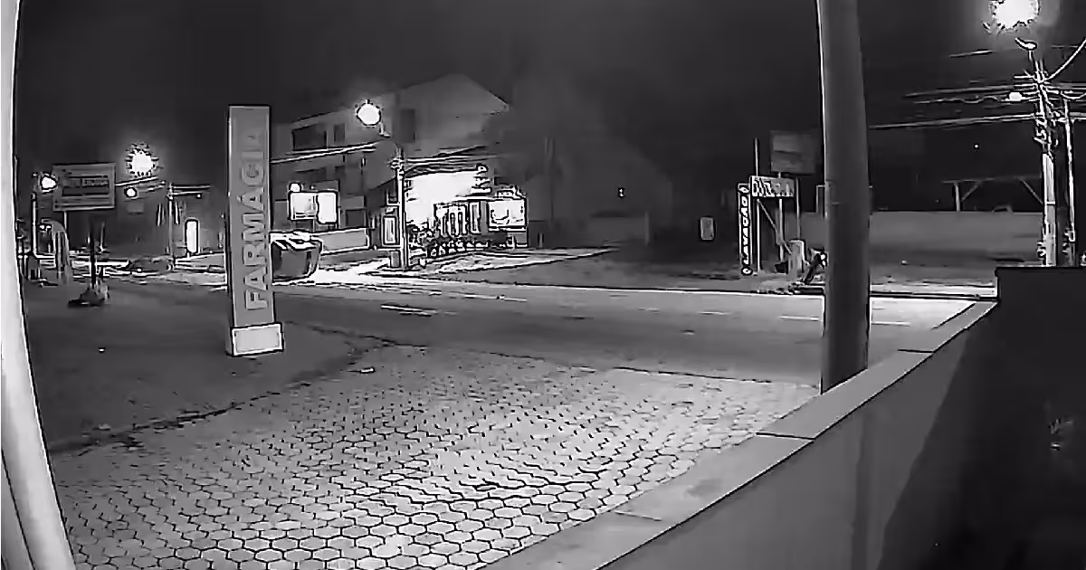 O momento do acidente foi registrado por uma câmera de monitoramento. Nas imagens é possível ver o momento em que o carro colide na ilha e capota logo em seguida.