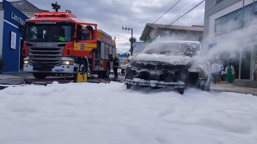 Um carro pegou fogo no Centro de Brusque na manhã desta sexta-feira, 6. O incidente aconteceu na rua Barão do Rio Branco, por volta das 10h20.