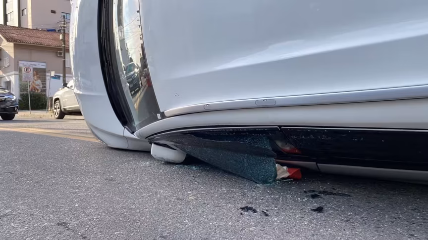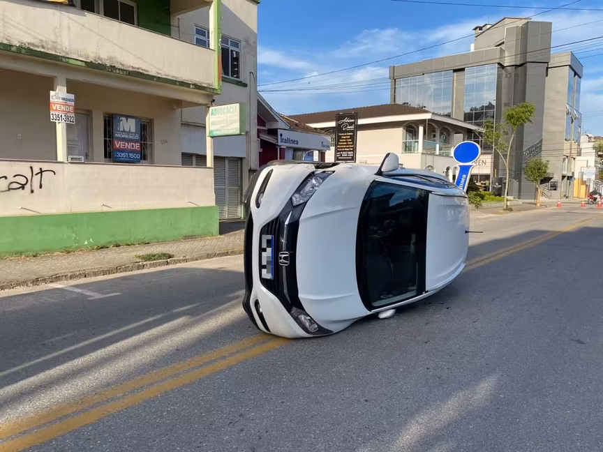 No final da tarde desta terça-feira, 26, um carro, da marca Honda, modelo HR-V, da cor branca, tombou na rua Hercílio Luz, Centro de Brusque. A motorista, 20 anos, colidiu com um veículo, da marca Jeep, modelo Compass, versão Longitude, estacionado, o que causou o tombamento do carro.