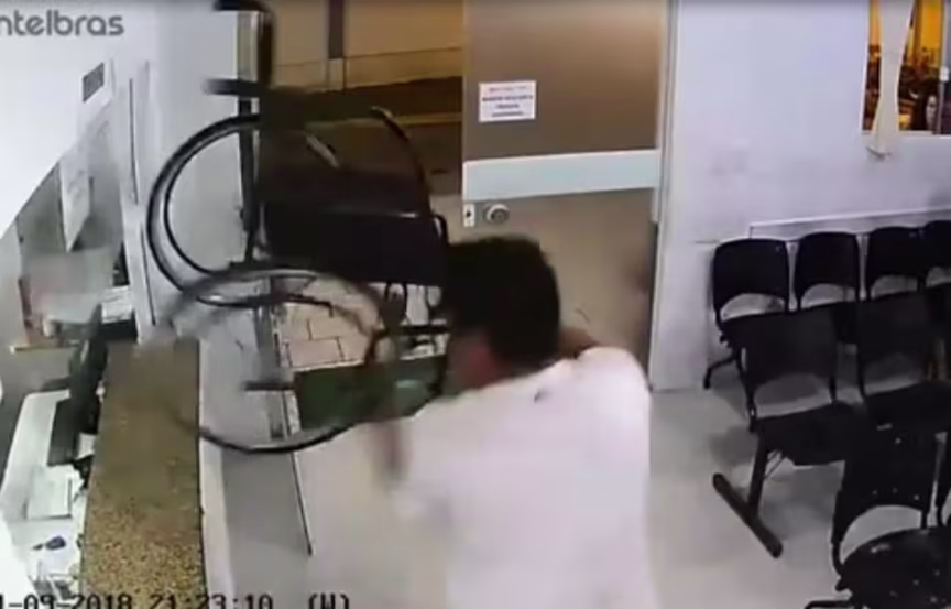 Vídeo flagra pai e filho usando cadeiras para destruir guichê de hospital, em Itapema