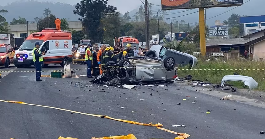 O acidente aconteceu por volta das 7h45. Pelas imagens, é possível ver um dos carros destruído. Ele está tombado na via. Já o outro está fora da rodovia, também tombado.