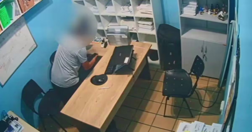Por fim, ela afirma que um boletim de ocorrência será realizado. Pelas imagens, é possível ver o homem abrindo gavetas e pegando dois celulares em uma mesa.