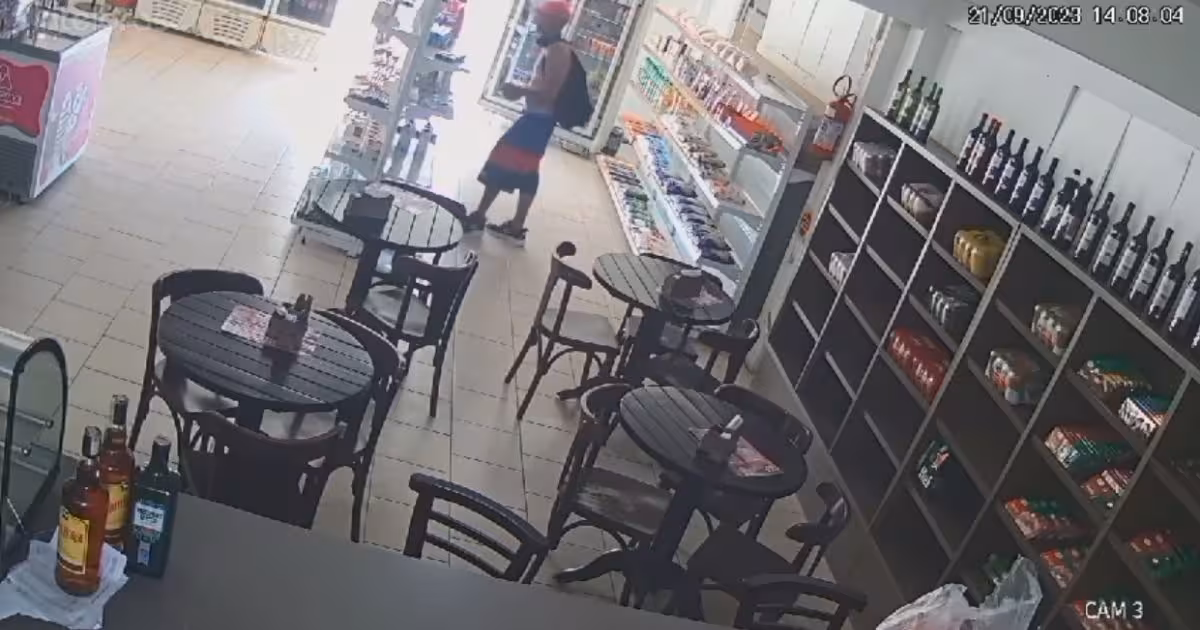 A câmera de segurança da padaria registrou o momento em que o homem pega os produtos e coloca dentro dos bolsos da bermuda e em uma mochila. Segundo informações, ele teria levado um pacote de bolachas, três caixas de suco e uma lata de refrigerante e quando foi ao caixa do estabelecimento, sacou de sua cintura uma faca, saindo sem pagar pelos produtos.