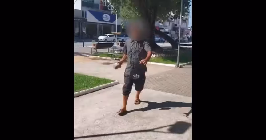Uma mulher registrou o momento em que um homem profere xingamentos a ela e ameaça agredi-la com uma pedra na praça Barão de Schneeburg, no Centro de Brusque. O registro foi feito no sábado, 24, e ela registrou um boletim de ocorrência.