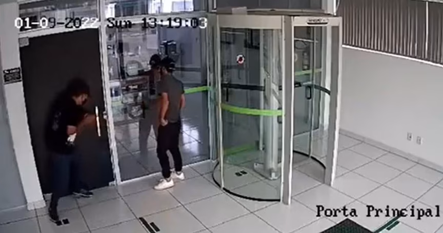 No vídeo, é possível ver a ação de dois homens na agência. Um deles arrombou a porta da agência com uma ferramenta enquanto o outro observava o interior do local.