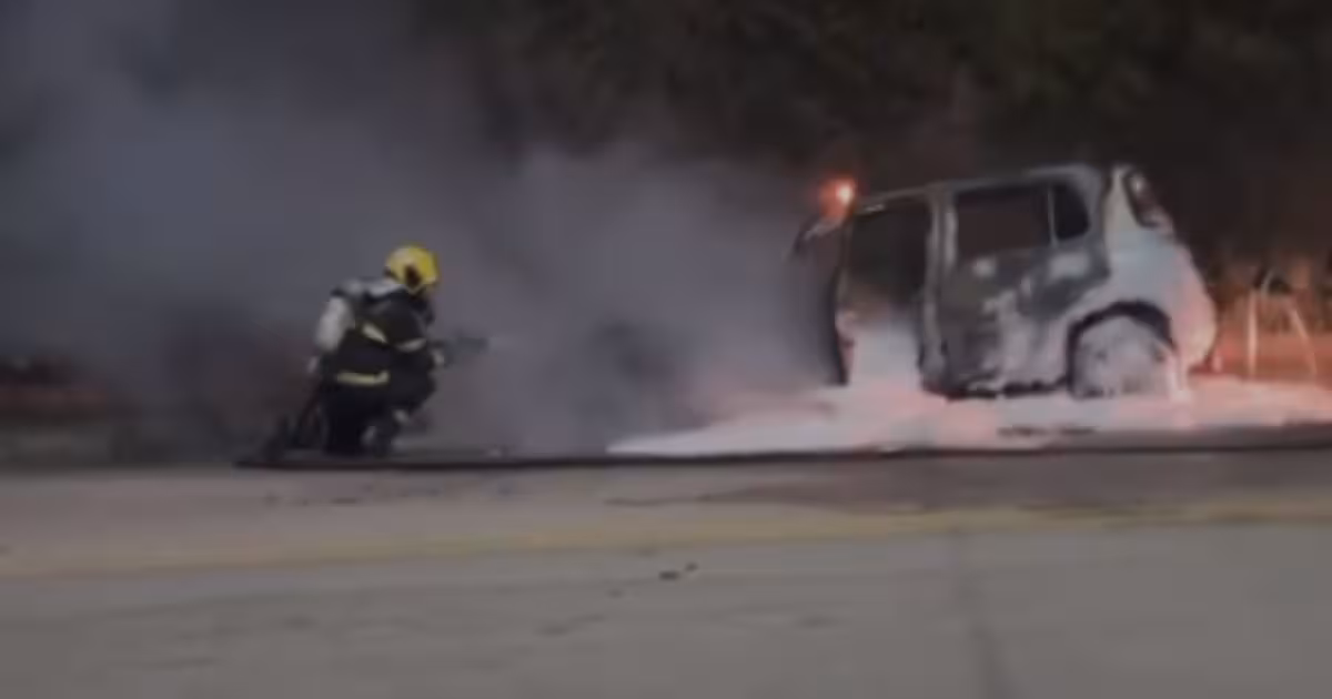 Imagens registradas por um morador mostram um Fiat Uno prata, estacionado ao lado da via no sentido bairro-centro, completamente destruído após as chamas.