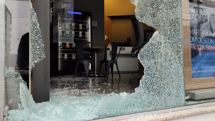 Na manhã desta segunda-feira, 8, a loja da operadora Tim, localizada no Centro de Brusque, teve a fachada quebrada e materiais furtados. Uma pedra, provavelmente usada para quebrar um dos vidros, foi encontrada na frente da loja.