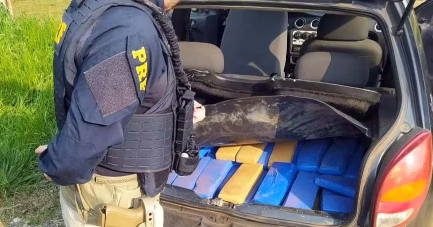 Após receber informações, o veículo suspeito, um GM/Celta, foi identificado e abordado. Foram localizados tabletes de maconha no assoalho traseiro do carro e outros no porta-malas, somando 143 quilos.