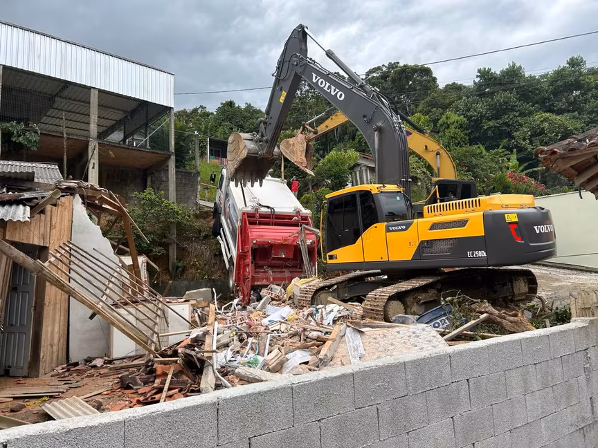 Os trabalhos para retirada do Caminhão que tombou sobre uma casa na localidade do Volta Grande, bairro Bateas, em Brusque, no dia 30 de janeiro, estão em andamento na tarde desta sexta-feira, 2.