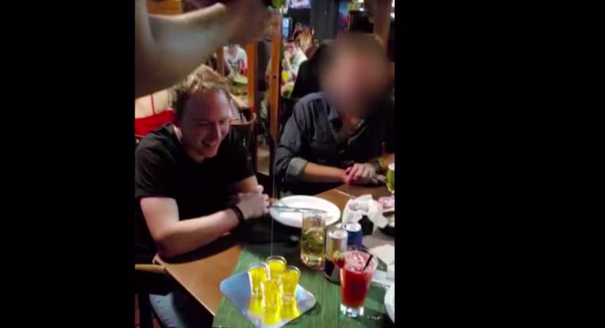 Na cena gravada, Prestini conversa com um homem e pelo menos mais uma pessoa que está diante dele, onde é possível ver uma bolsa feminina. O garçom serve quatro doses de Licor 43, uma bebida de origem espanhola com 30% de teor alcoólico. Diante dele também há um copo com gelo, uma bebida que não é possível identificar, e uma lata de energético.