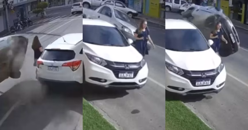 Conforme as imagens, a mulher estava caminhando próxima a um carro estacionado quando o motorista de uma Montana, ao tentar manobrar, colidiu contra um Honda/HR-V. No momento do impacto, a pedestre se assusta e corre rapidamente para a calçada.