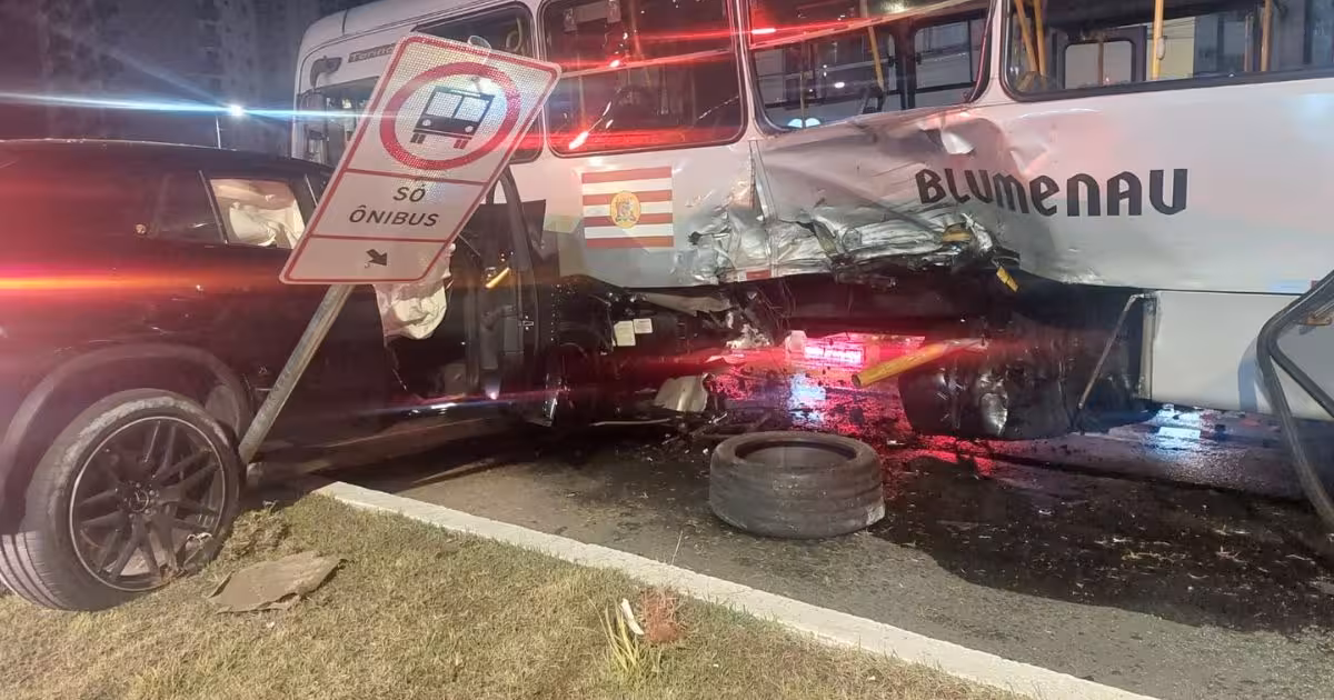 Nove pessoas ficaram feridas após uma colisão entre um carro e um ônibus na madrugada desta terça-feira, 20, em Blumenau. O acidente ocorreu no cruzamento entre as ruas Sete de Setembro e Humberto de Campos, no Centro, por volta de 4h40.