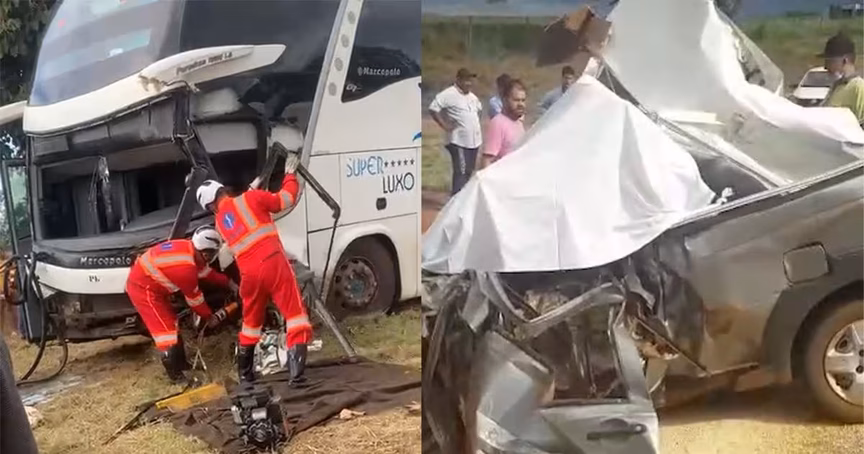 Segundo a PRF, o carro bateu frontalmente contra o ônibus. Com o impacto, o carro foi jogado para trás e acabou acertando uma motocicleta.