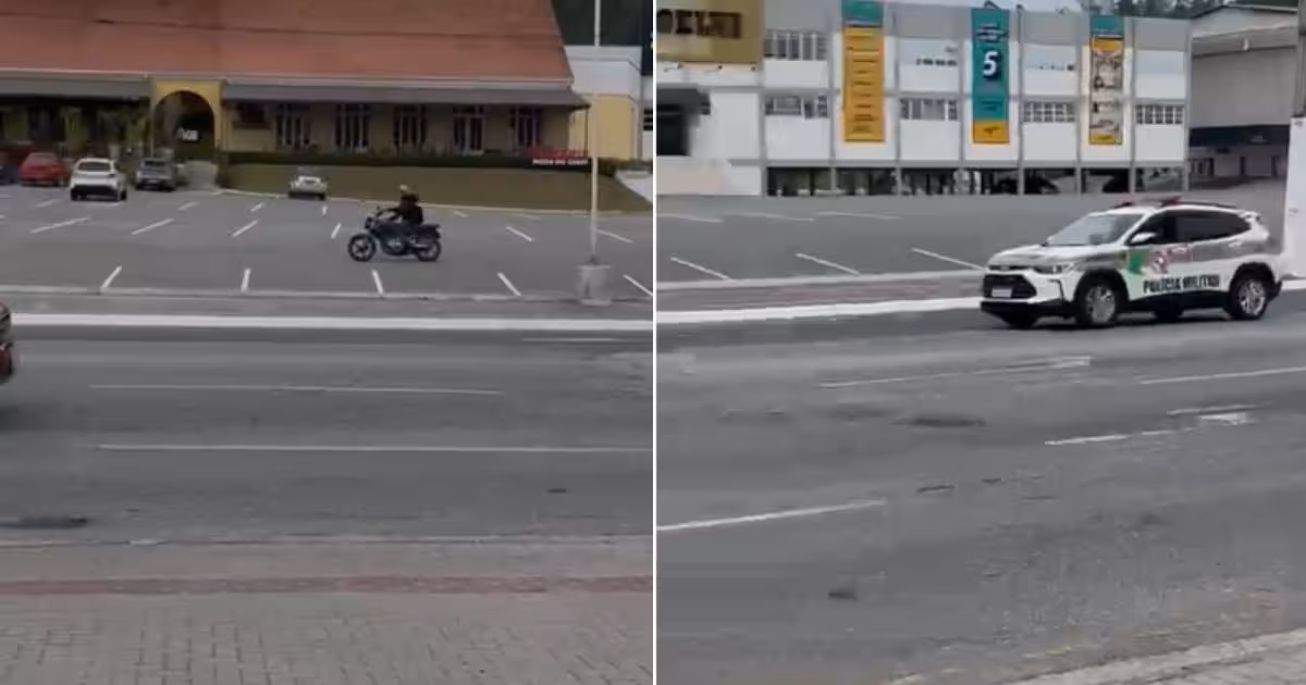 Uma perseguição entre a Polícia Militar e um motociclista foi flagrada na manhã deste sábado, 3, no Centro de Brusque. O caso foi registrado por volta das 9h. Imagens mostram o motociclista fugindo da viatura pelo estacionamento da Villa Schlösser, na avenida Getúlio Vargas.