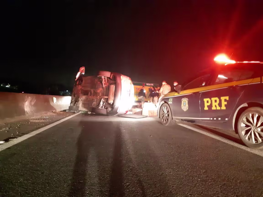 Policiais rodoviários federais, com apoio da PM, perseguiram veículo de Joinville até Itajaí; carro capotou após colisão com viatura