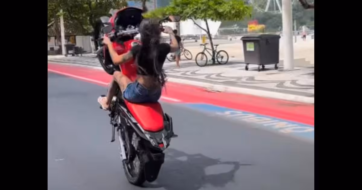 A motocicleta de uma mulher identificada como influenciadora digital de Balneário Camboriú foi apreendida na tarde desta quarta-feira, 7. Ela foi flagrada sem capacete enquanto realizava manobras perigosas na Avenida Atlântica. A motocicleta também estava sem placa.