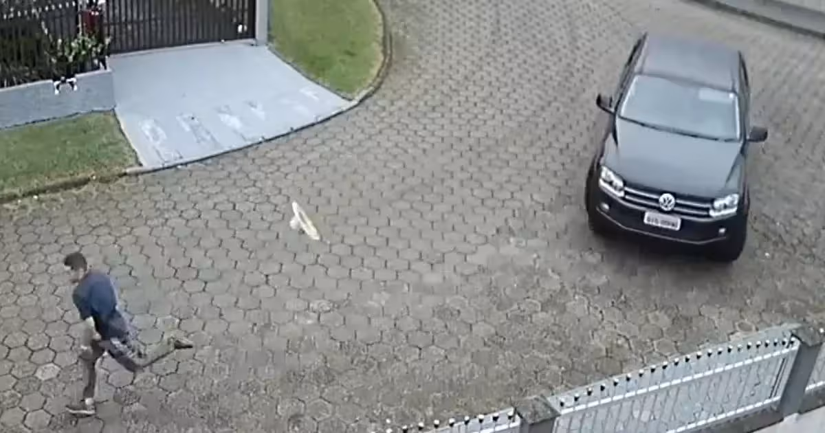 Conforme apurado, o suspeito teria roubado um veículo VW Amarok em Massaranduba e fugido para Blumenau. As imagens mostram ele abandonando o carro e deixando o local correndo. A viatura da PM para ao lado do automóvel.