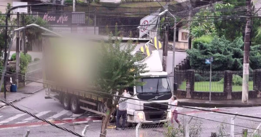 Imagens recebidas pela reportagem de O Município mostram o caminhão que bateu no limitador de altura na rua Gustavo Halfap, em Brusque, na manhã desta quarta-feira, 20.