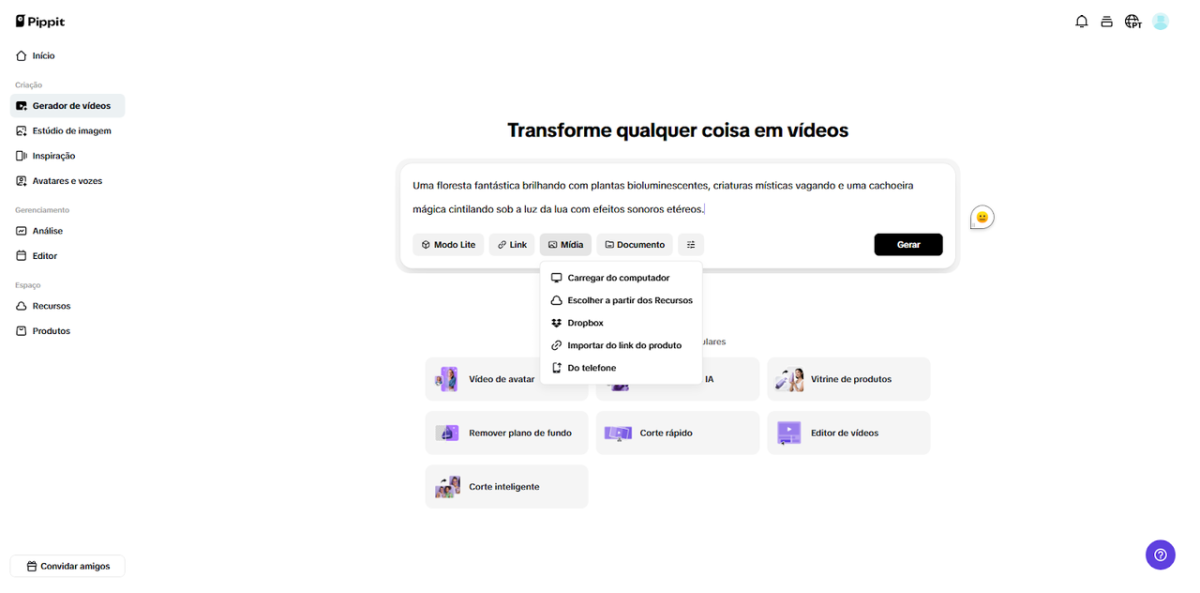 Acesse o Pippit e vá até a aba “Gerador de vídeos”. Digite seu prompt de texto para criar o vídeo com legendas em dois idiomas. Também é possível enviar mídias de referência. Isso ajuda o gerador de vídeos do Pippit a construir seu vídeo de acordo com o prompt e os arquivos. Para isso, clique em “Mídia” e faça upload a partir do seu dispositivo, celular, Dropbox ou cole um link. Se não tiver mídia, escolha entre os ativos disponíveis. Por fim, clique em “Gerar”.