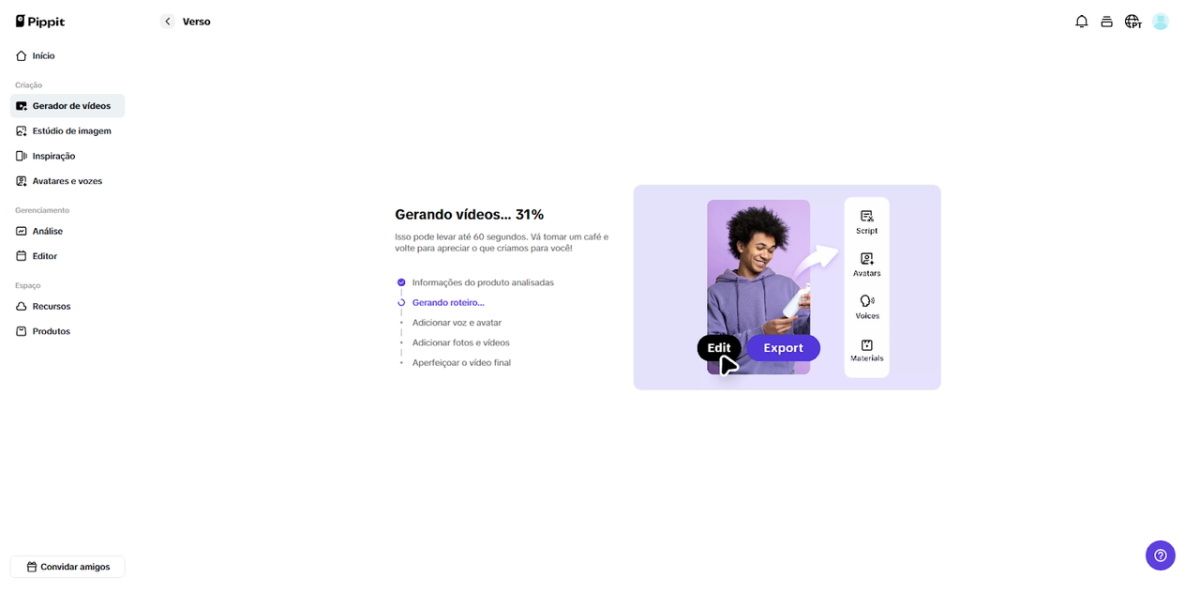Você receberá de 4 a 5 versões de rascunho. Selecione a que preferir. Caso queira ajustes, clique em “Editar mais” para abrir a interface de edição do Pippit.