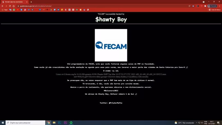 Hackers invadem e derrubam sites de prefeituras de SC; Guabiruba está entre atacadas 01/12/2021 • Redação O Município