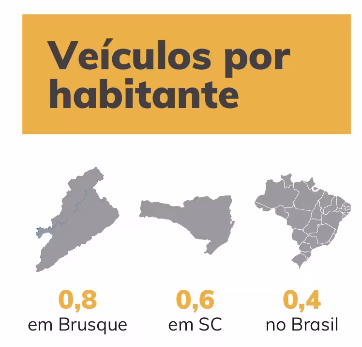 Brusque agora passa a integrar um seleto grupo de cidades catarinenses cuja frota é superior a seis dígitos. São apenas 11 dos 295 municípios: Blumenau, Chapecó, Criciúma, Florianópolis, Itajaí, Jaraguá do Sul, Joinville, Lages, Palhoça e São José. Entre essas cidades, aliás, Brusque é a que registra a maior proporção de veículos por habitante. Atualmente, conforme dados atualizados até maio, são 100.939 veículos circulando no município. Na média, há 0,8 veículo para cada habitante, considerando que a população estimada, conforme o Instituto Brasileiro de Geografia e Estatística (IBGE), é de 125.810. A média é maior que a do estado, que registra 0,6 veículo por habitante, e o dobro da média nacional, que é de 0,4 veículo por pessoa. Os números de Brusque, na última década, tem se destacado. Reportagem da Folha de São Paulo, de 2010, mostrava a cidade como a segunda com maior proporção carro/habitante, dentre os municípios brasileiros com mais de 100 mil habitantes. À época, a cidade possuía 71,4 veículos para cada 100 habitantes. Atualmente são 80 veículos para cada 100 habitantes.