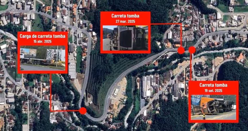 Três tombamentos registrados em 2025 aconteceram na rua dos Imigrantes, o principal acesso entre Brusque e Guabiruba, pelo bairro Guarani. O quarto acidente ocorreu na rua São Pedro.
